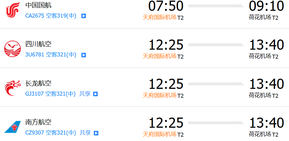 成都天府國(guó)際機(jī)場(chǎng)每天都有直飛張家界荷花機(jī)場(chǎng)的航班,具體參考如下: