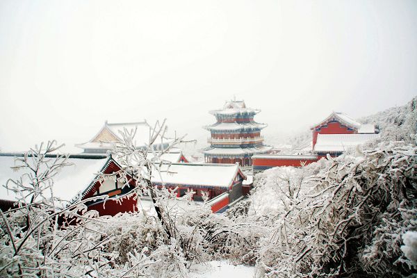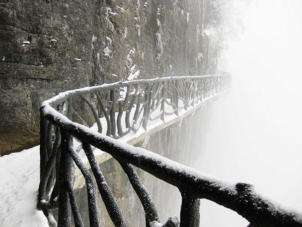 順著路一直走走拍拍,連不愛照相的俺都忍不住吆喝著來一張來一張。俺兄弟一邊拍一邊不惜余力地打擊俺:您老就別糟踐這美景了。走在鬼谷棧道,一側(cè)是山壁,一側(cè)是霧氣籠罩的懸崖,后來又下起雪來,真有點深山求仙的味道。其實一路走來并不累,就是總不得不從被冰掛壓倒的樹下鉆身而過,累得腰酸。再有就是俺一度說要雪盲了,眼睛都有點發(fā)花。最后終于到了頂端的天門山寺。確實要承認(rèn),在這樣的一番情景之下,佛性也顯得格外深沉,連那個向來不信的家伙也雙手合十。本來還想隨喜瞻仰一下佛祖真身舍利的,可被那個賣票的痞子樣給雷到而作罷。