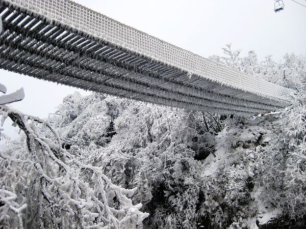 由于淡季,不用排隊很快坐上了索道,前前后后的轎廂內(nèi)都沒人,俺倆坐著好不優(yōu)哉。索道漸次翻越而后陡然爬升,進入乳白色的氤氳之中,最后全被濃厚的霧氣包裹,像在云霧中漂移。俺又爽又驚,心想神仙還真不是好當(dāng)?shù)?。看著前面的操作說明:沒事,這個挺先進的,碰到惡劣天氣會自動停止運行。話音剛落,它就停了,然后左右左右的晃啊晃啊。俺顫顫地問:怕嗎?他說:嗯……還,還成。俺喃喃地道:靠,俺可不想死呢……終于正襟危坐地熬過了那幾分鐘的晃悠,繼續(xù)上行后,霧氣淡了許多,這才看到索道支架和輪軌竟然都凍上厚厚的冰掛。心肝一顫:不是吧,這是到哪了???!