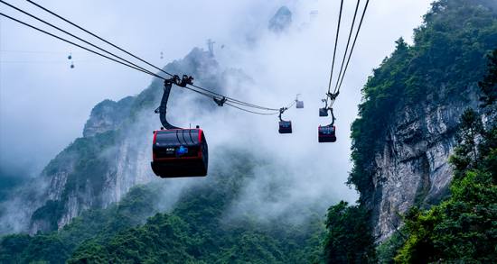 天門(mén)山索道全長(zhǎng)7455米,水平高差1279米,沿線盡為絕壁天險(xiǎn),氣勢(shì)沖天,是世界上最為壯觀的索道之一。它以張家界市中心城市花園為起點(diǎn),經(jīng)民間田園風(fēng)光而達(dá)山頂?shù)脑伎罩谢▓@,猶如一道彩虹飛渡“人間”“天上”。