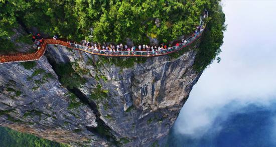 棧道全長(zhǎng)1600米,平均海拔為1400米,起點(diǎn)是倚虹關(guān),終點(diǎn)到小天門(mén)。與其他棧道不同的是,鬼谷棧道全線既不在懸崖之巔,也不在懸崖之側(cè),而是全線都立于萬(wàn)丈懸崖的中間,給人以與懸崖共起伏同屈伸的感覺(jué)。 站在棧道上俯瞰群山,古人“會(huì)當(dāng)凌絕頂,一覽眾山小”的感覺(jué)油然而生。由于天門(mén)山是國(guó)家森林公園,植被特別豐富,加上典型的喀斯特地貌,所以,在這條棧道上更能找到一種在乘坐直升飛機(jī)飛越熱帶雨林大峽谷的感覺(jué),這平時(shí)只能在電影里看到的場(chǎng)景,在這里能讓你身臨其境。 由于海拔和氣流的影響,很多小鳥(niǎo)都不能到達(dá)與棧道平行位置。所以,站在這里,腳下是沒(méi)有邊際的綠野,成群的小鳥(niǎo)在峽谷中嬉戲,偶爾有老鷹從眼前掠過(guò),閉上眼,挺著發(fā)麻的雙腿,帶著急促的心跳,伸開(kāi)雙臂,你就能得到一次最完美、最刺激、最貼近自然的SPA。因?yàn)椋肋@種在懸崖上賞風(fēng)景一般都是非人類所能享受的。 如果是雨前雨后,在棧道上則是身邊霧氣盤(pán)繞,腳下云海翻騰,令人抬腿似生霧,邁步如踏云,人間天界,世外洞天也就是如此了。 據(jù)施工人員介紹,此條棧道也是他們所修棧道中施工最難,最險(xiǎn)峻的一條。如果您還覺(jué)得不夠刺激的話,在棧道的完結(jié)處的兩個(gè)懸崖之間有一條長(zhǎng)160米的懸索吊橋,同時(shí),在海拔最高點(diǎn)還有一個(gè)挑戰(zhàn)心里極限的玻璃站臺(tái),在這里,如果你能挺直腰板伸開(kāi)雙臂,那么,您就是真正的勇士了。